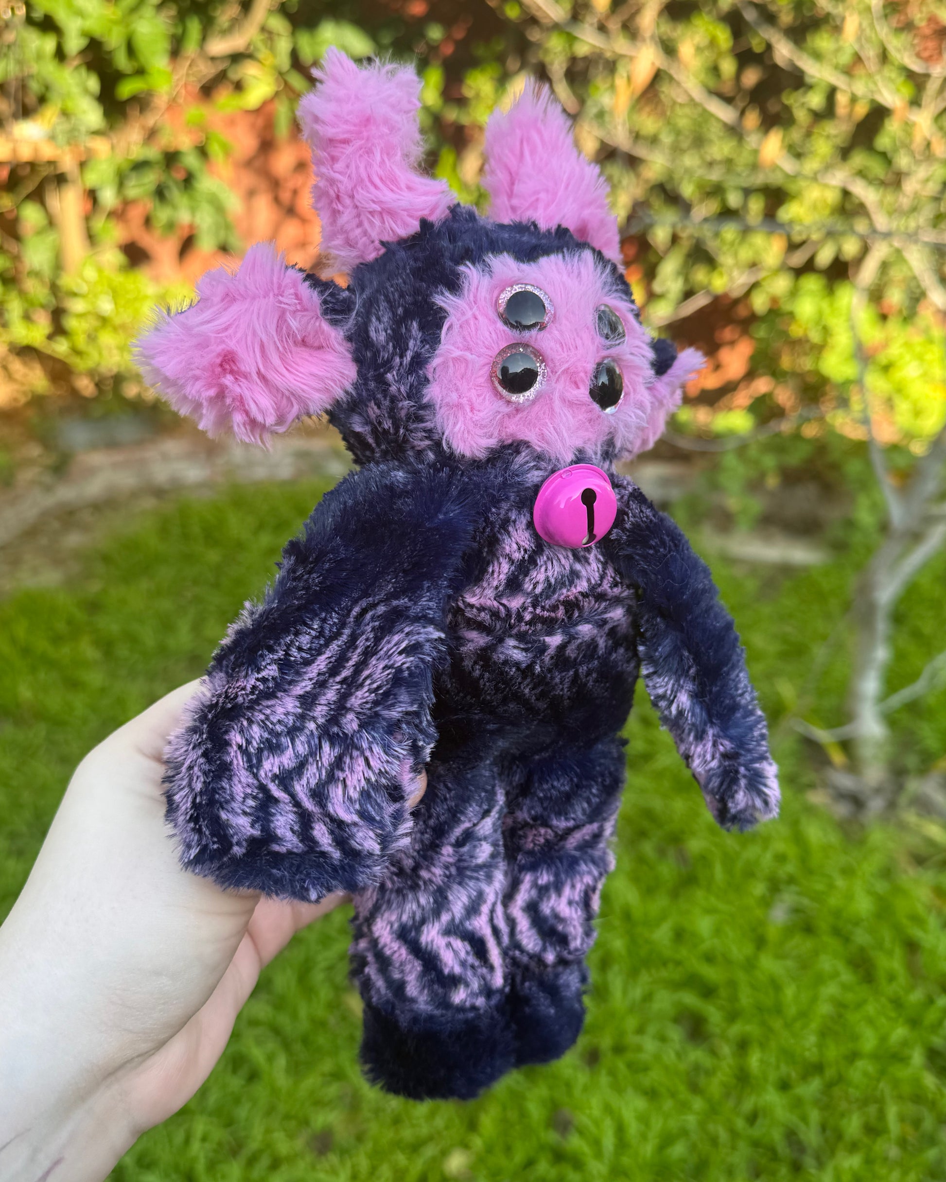 Small monster plush made out of faux minky rabbit fur and is 11 inches tall