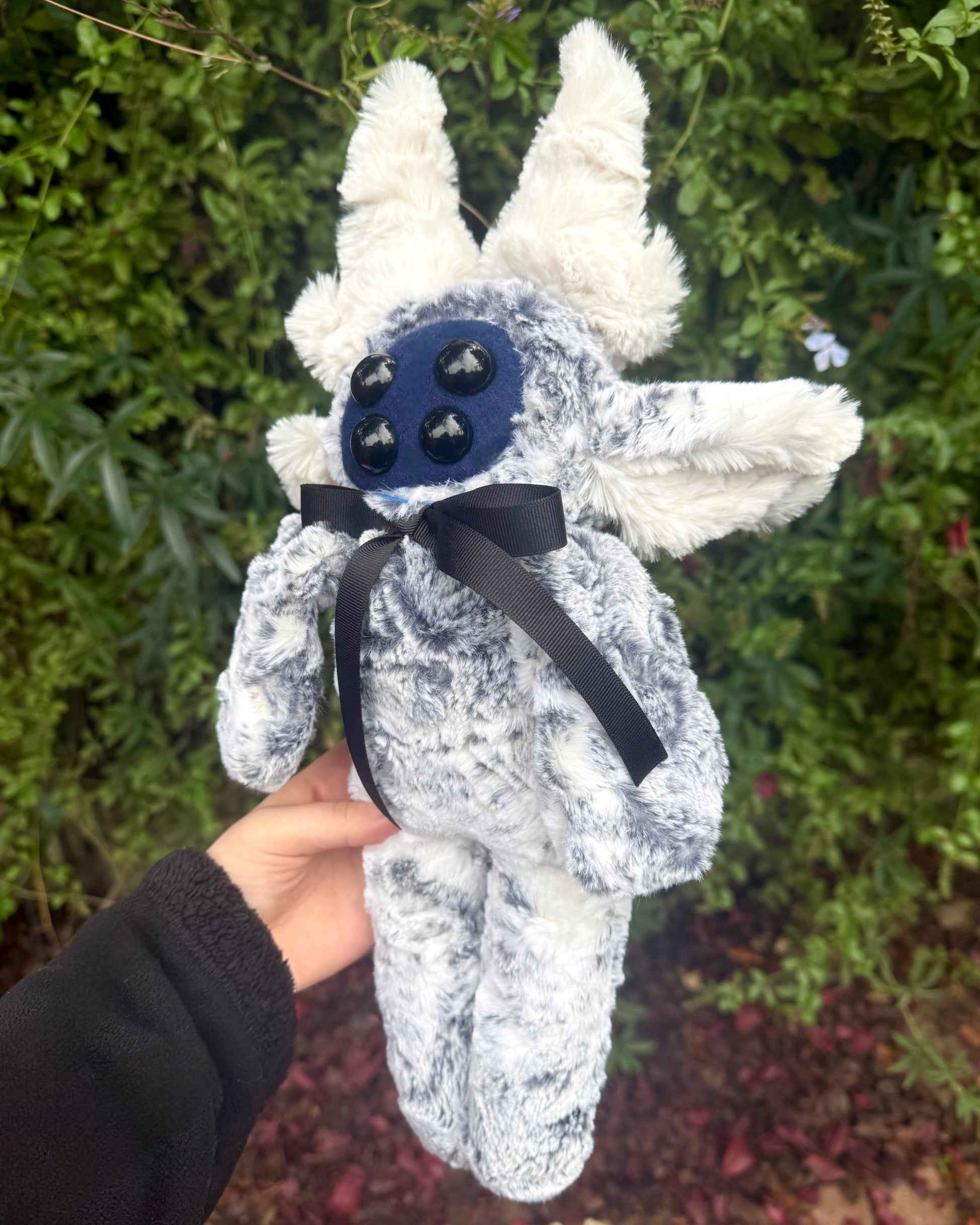 Coal is a handmade plushie made out of faux rabbit fur in a snow owl pattern and a dark navy blue felt fabric. Coal also has a bow on there neck and black eyes !