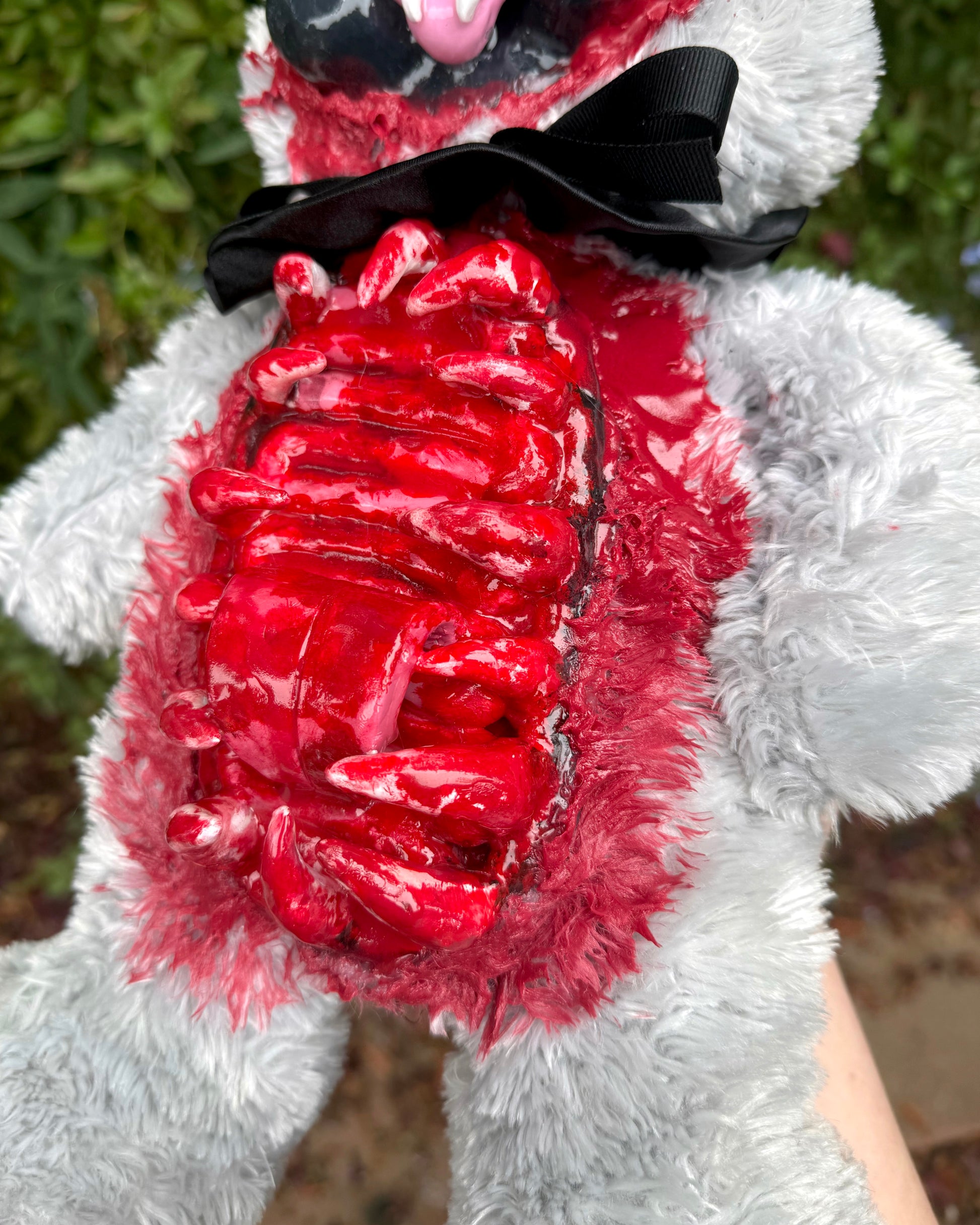 Grumble is an up cycled plushy I made using clay. Under stomach, they have a plate with organs, a tongue sticking out and rib cage bones, going all the way around the plate. They also have a clay face that I made and using UV resin. I put blood all over them.