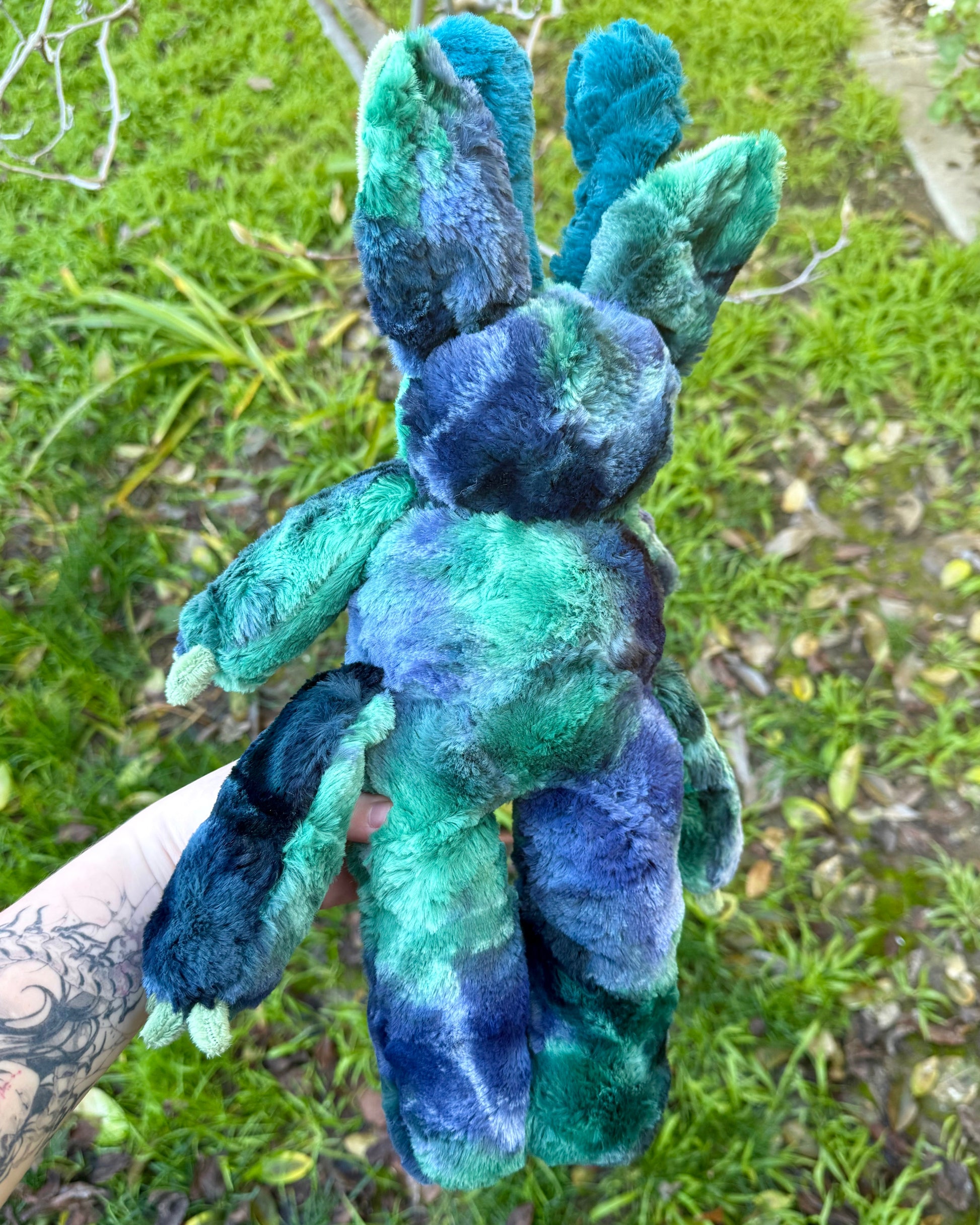 Indigo is a handmade alien cat plushy made out of faux minky rabbit fur in a tie-dye blue-green color. I also used a green minky fabric for ears and claws and blue in rabbit mink for the antennas. Indigo also has a glitter star on their tummy with blue, black and green glitter