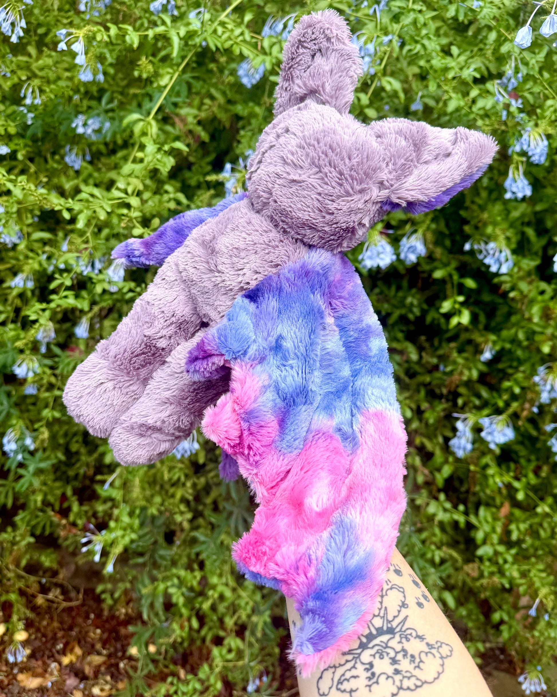 Handmade plushie made out of minky faux rabbit in tie-dye and purple-gray fabric.