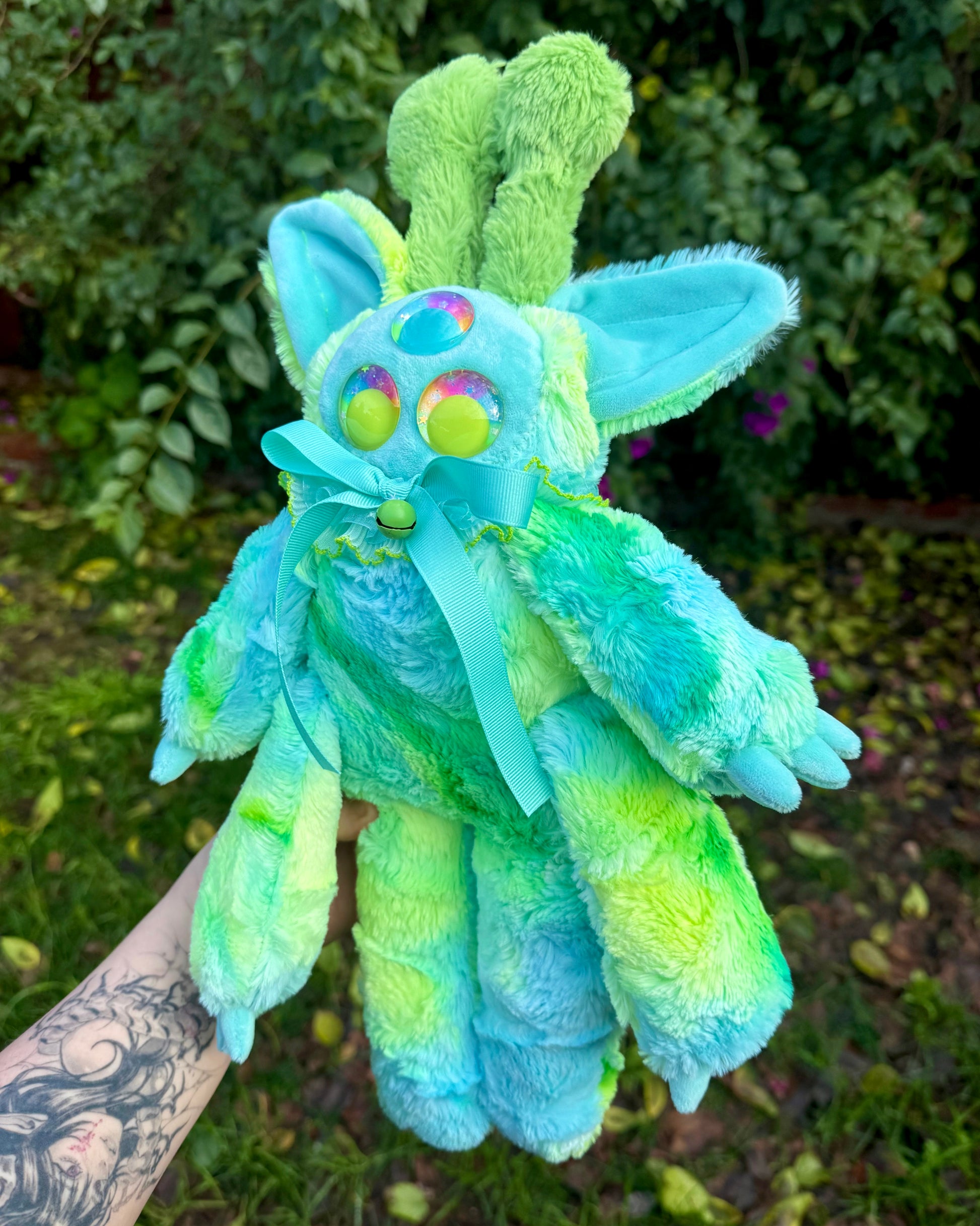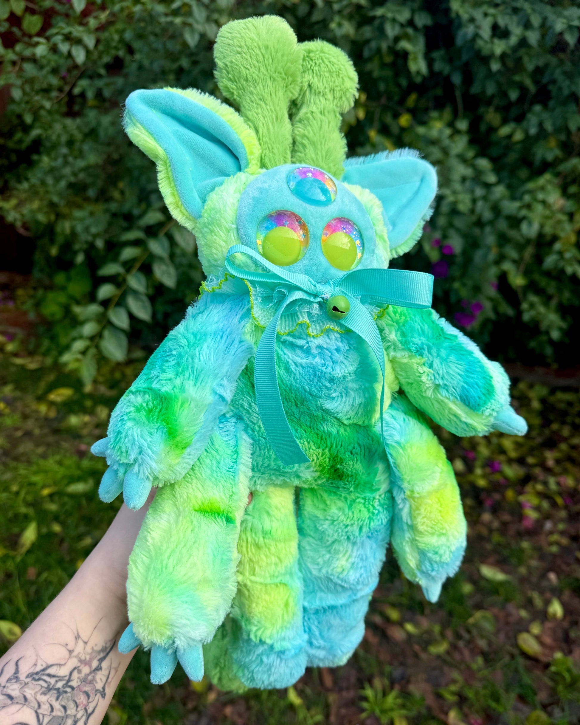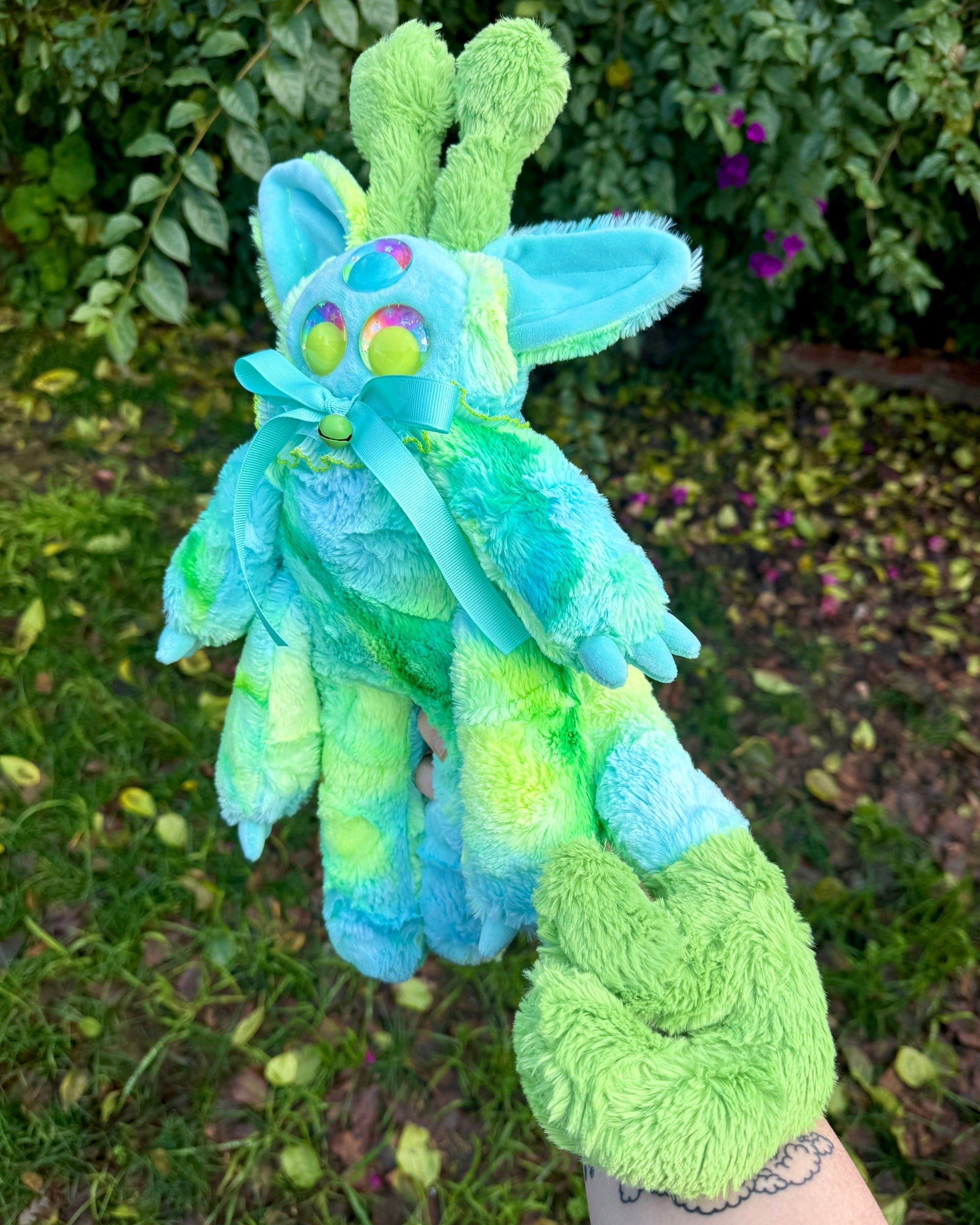 Millie is a handmade alien cat plushie made out of faux minky rabbit fur in green-blue-yellow tie-dye along with teal blue minky mochi fabric .Millie also has a double tail dip ,blue bow and a green bell ,along with claws on there hands !