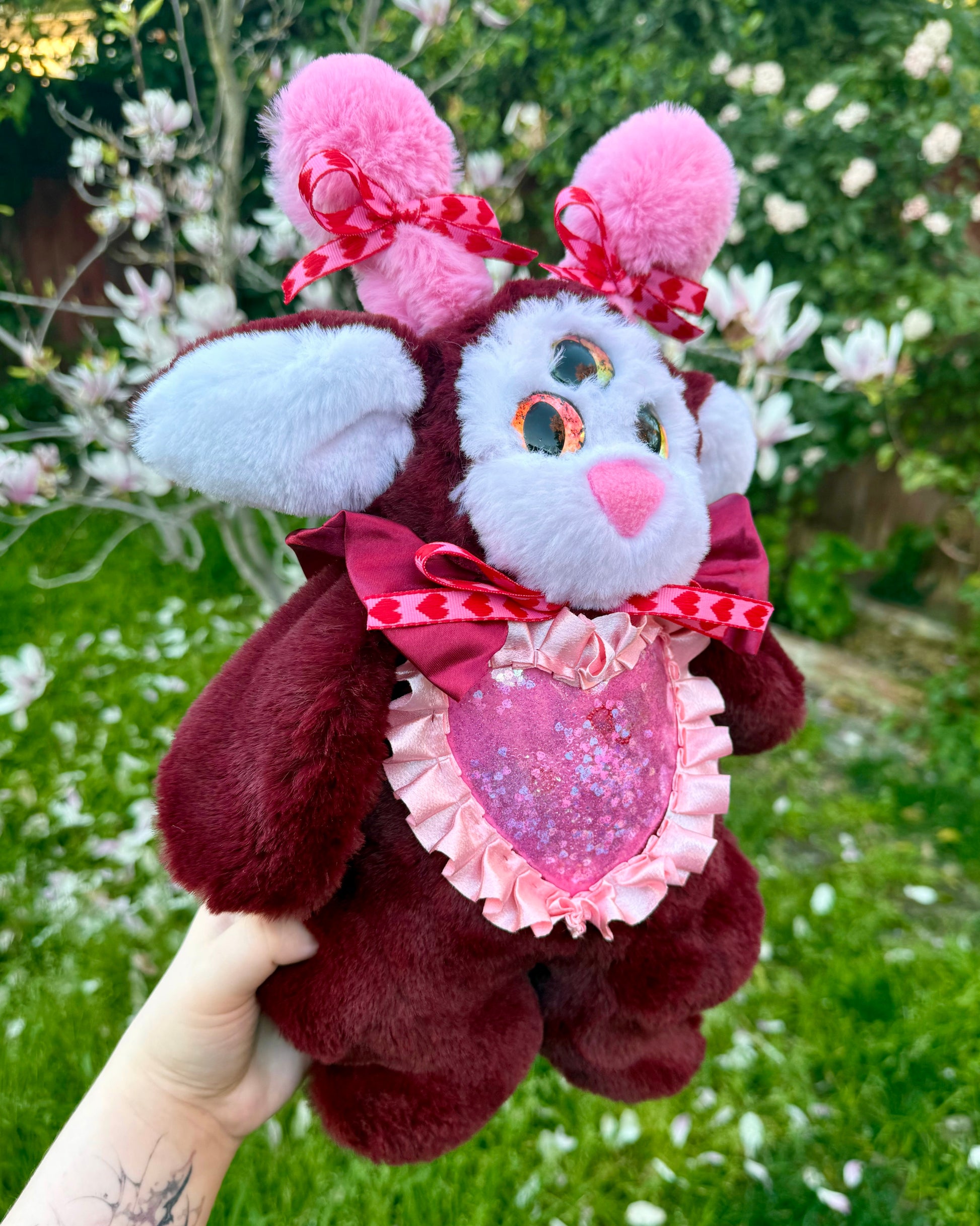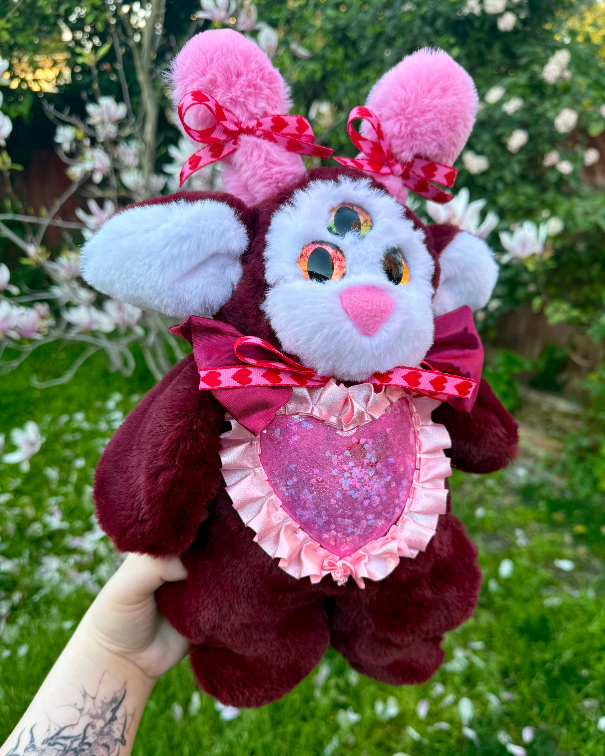 Mini is a handmade plushie make out of faux seal snuggle fur in the colors Merlot red , white, and bubblegum pink. They also have a glitter heart on there tummy with ribbon around the heart , bows on there antennas and a ruffled collar.